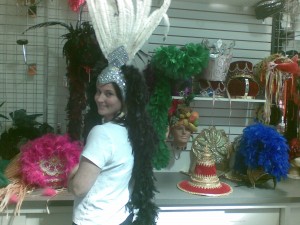 Amy checking out the headpieces. Maybe our next play will be a Vegas showgirl act. Hmm…not likely.