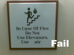 As I waited for the hotel elevator this morning, I glanced briefly at the sign hanging on the wall in front of me. It’s one of those standard warning signs providing instructions for what to do in case of a fire — only this time something was different.
