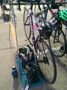 Give yourself plenty of time on race day, especially if it’s your first duathlon. You don’t want to be rushed, and it will help you secure a good spot on a rack. Select a rack near the run in/out and bike in/out areas. If you are in the middle of a long line of racks, count the rows so you know where your bike is hanging. When there are hundreds or thousands of bikes, it can be difficult to find yours. You’ll also be in a hurry, so it’s easier to just count the racks as you come in from your run. Also, try to get a good spot on the rack. I prefer the end because you have more space for your gear (see pic below). Finally, enjoy the sunrise, and since you arrived early, spend some time meeting the people around you.